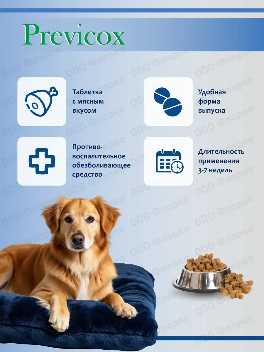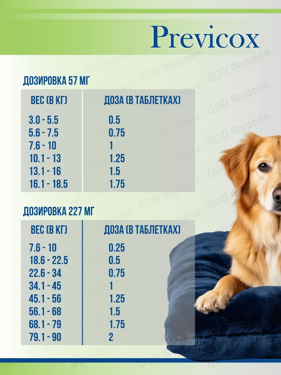 Превикокс для собак: безопасный НПВП (нестероидный противовоспалительный препарат) для вашего питомца. Так называют препараты негормональной природы, которые оказывают противовоспалительное, жаропонижающее и обезболивающее действие.При каких заболеваниях назначают Превикокс?Остеоартрит .Операции на мягких тканях .Стоматологические операции Операции на костях, связках и сухожилиях Превикокс действует как болеутоляющее, снимает воспаление и избавляет от хромоты. При заболеваниях суставов его можно применять до 90 дней без контроля ветеринарного врача. Также препарат используется в хирургической практике. Он улучшает состояние животного после операции и помогает вернуться к прежней активности.Как правильно давать собаке лекарство?Рекомендуемая суточная доза — 5 мг/кг массы тела.Примеры расчёта дозы Если собака весит 12 кг, суточная доза для неё составит 60 мг (12 кг х 5 мг). Это немногим больше, чем 1 таблетка Превикокса 57 мг. Поскольку таблетку можно разделить максимум на 4 части, рекомендованная доза — 1 ¼ Превикокса 57 мг.Питомцу весом 10 кг хватит одной таблетки 57 мг (10 кг х 5 мг = 50). Либо можно покупать таблетки 227 мг и давать собаке по четвертинке в день — так получится дешевле.Крупным животным весом 60–65 кг требуется 1,5 таблетки Превикокса 227 мг в сутки (65 кг х 5 мг = 325 мг).Если не доверяете своим подсчётам и боитесь ошибиться, воспользуйтесь инструкцией к препарату. В ней содержится таблица, где указаны все возможные дозировки с точностью до ¼ таблетки. Не превышайте рекомендованной дозы и не оставляйте упаковку с таблетками в доступном для питомца месте. При появлении симптомов передозировки (повышенное слюноотделение, вялость, рвота) срочно обратитесь к ветеринарному врачу.Способ применения Препарат дают собакам 1 раз в день. У таблеток приятный вкус, поэтому большинство собак охотно поедают их, как лакомство. Если питомец отказывается глотать таблетку, просто добавьте её в корм.