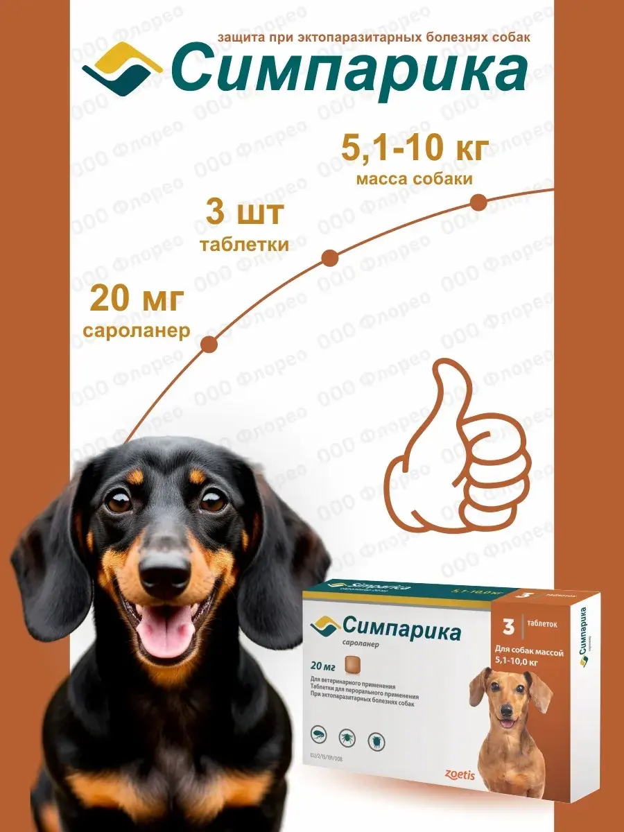Симпарика для собак до 10 кг. Препарат начинает действовать через 4 часа после применения и вызывает гибель блох через 8 часов после прикрепления к организму хозяина, клещей — через 12 часов, предотвращая повторную инфестацию собак эктопаразитами. Гибель блох происходит до откладки яиц, что профилактирует контаминацию помещений яйцами и личинками. Симпарика по степени воздействия на организм относится к веществам «малоопасным» (4 класс опасности по ГОСТ 12.1.007-76), в рекомендуемых дозах не оказывает эмбриотоксического, тератогенного, мутагенного действия. Симпарика назначают собакам для лечения и профилактики афаниптероза, в комплексной терапии вызываемого блохами аллергического дерматита, акарозов, вызываемых иксодовыми клещами, для лечения демодекоза, саркоптоза и отодектоза, а также для снижения риска бабезиоза.