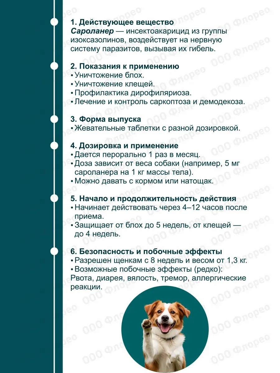 Симпарика - инновационный препарат для защиты домашних животных от клещей, блох и других паразитов. Этот ветеринарный препарат представлен в форме таблеток и предназначен для применения у собак разных пород и возрастов, обладает широким спектром действия и эффективно уничтожает клещей (анти клещ), блох (обработка от блох) и других паразитов, обеспечивая длительную защиту вашего питомца.