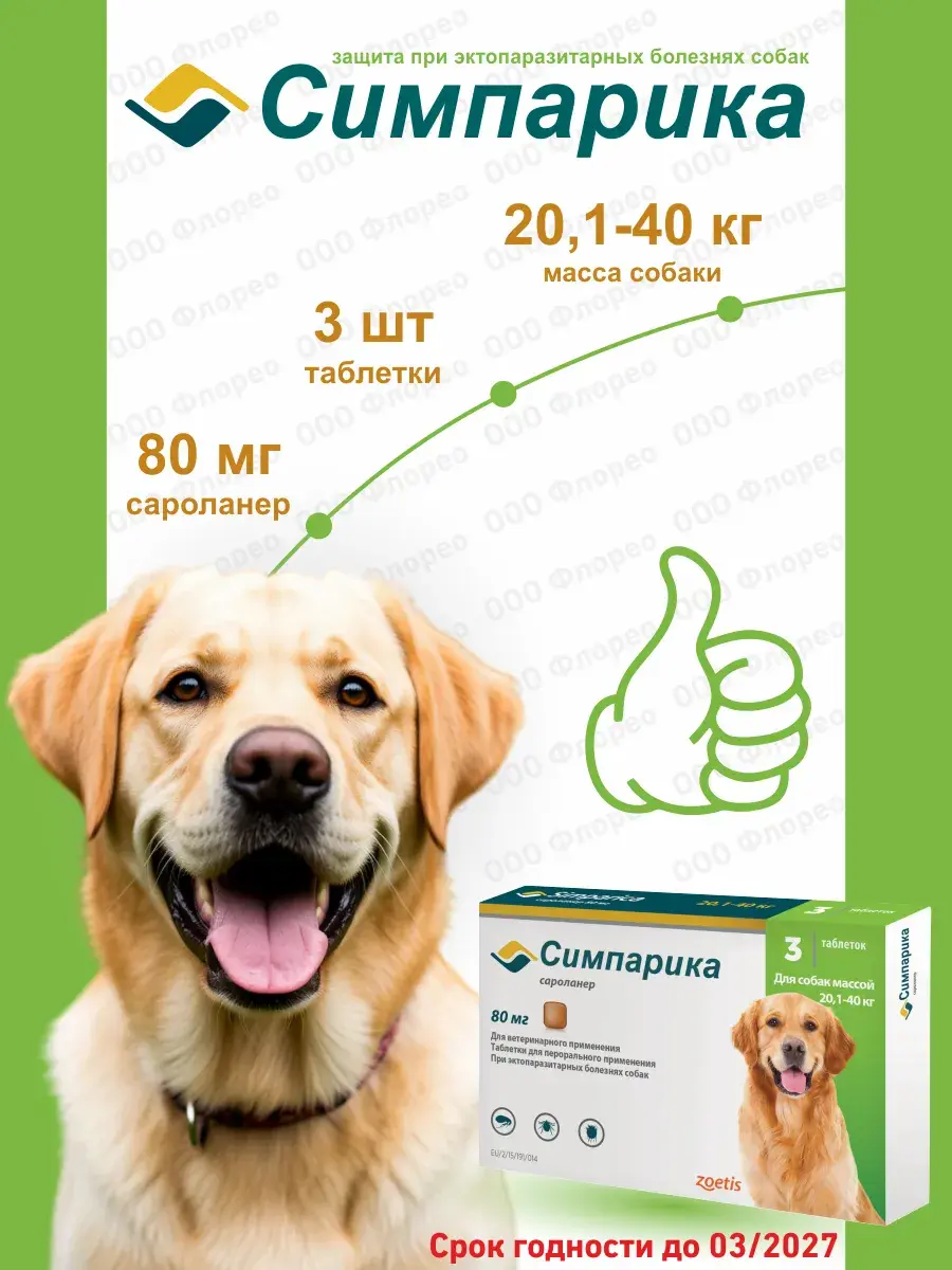 Симпарика для собак до 40 кг. Препарат начинает действовать через 4 часа после применения и вызывает гибель блох через 8 часов после прикрепления к организму хозяина, клещей — через 12 часов, предотвращая повторную инфестацию собак эктопаразитами. Гибель блох происходит до откладки яиц, что профилактирует контаминацию помещений яйцами и личинками. Симпарика по степени воздействия на организм относится к веществам «малоопасным» (4 класс опасности по ГОСТ 12.1.007-76), в рекомендуемых дозах не оказывает эмбриотоксического, тератогенного, мутагенного действия. Симпарика назначают собакам для лечения и профилактики афаниптероза, в комплексной терапии вызываемого блохами аллергического дерматита, акарозов, вызываемых иксодовыми клещами, для лечения демодекоза, саркоптоза и отодектоза, а также для снижения риска бабезиоза.