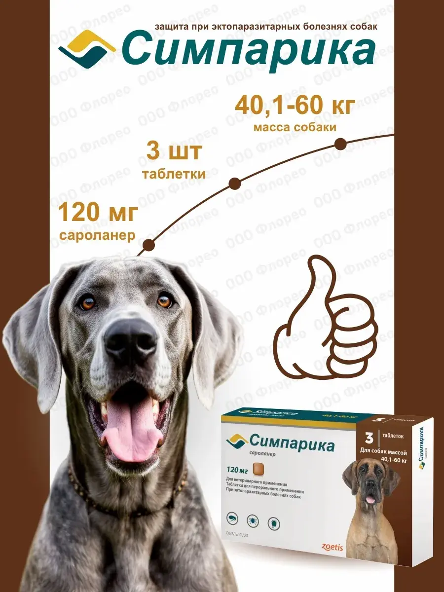 Симпарика для собак до 60 кг. Препарат начинает действовать через 4 часа после применения и вызывает гибель блох через 8 часов после прикрепления к организму хозяина, клещей — через 12 часов, предотвращая повторную инфестацию собак эктопаразитами. Гибель блох происходит до откладки яиц, что профилактирует контаминацию помещений яйцами и личинками. Симпарика по степени воздействия на организм относится к веществам «малоопасным» (4 класс опасности по ГОСТ 12.1.007-76), в рекомендуемых дозах не оказывает эмбриотоксического, тератогенного, мутагенного действия. Симпарика назначают собакам для лечения и профилактики афаниптероза, в комплексной терапии вызываемого блохами аллергического дерматита, акарозов, вызываемых иксодовыми клещами, для лечения демодекоза, саркоптоза и отодектоза, а также для снижения риска бабезиоза.