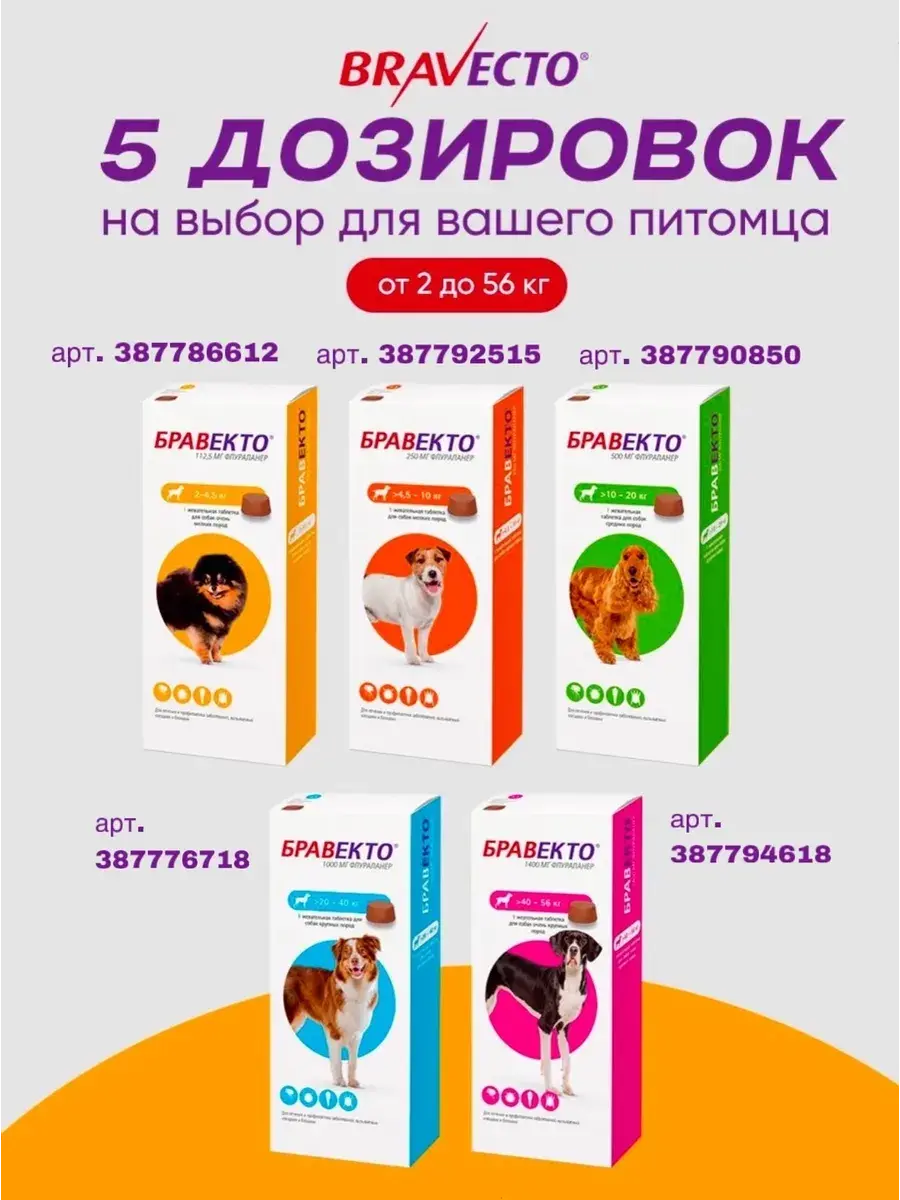 Bravecto (бровектор) - инновационный препарат для защиты домашних животных от клещей, блох и других паразитов. Этот ветеринарный препарат барвекта представлен в форме таблеток и предназначен для применения у собак разных пород и возрастов, весом от 2 до 40 кг (градация препарата: бравекто 2-4,5 кг для собак ,барвекто для собак до 4,5 кг, 4,5-10кг, бравекто для собак 4.5-10кг, 10-20 кг, бравекто 10-20кг, 20-40кг). Бровекто (бервекто) обладает широким спектром действия и эффективно уничтожает клещей (анти клещ), блох (обработка от блох) и других паразитов, обеспечивая длительную защиту вашего питомца.